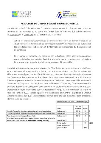 Cet index, relatif aux écarts de rémunération entre les femmes et les hommes, présente les résultats obtenus à chacun des indicateurs de mesure ainsi que les actions mises en œuvre pour supprimer les écarts.